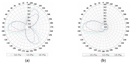 Figure 13 shows the contours of pressure distribution of blade 1 with different airfoil leading edge radius during one rotational period at TSR = 2.0. As can be seen, an obvious difference between the LE-1%c and LE-5%c model exists in the upwind region. With the increase of azimuth angle, the scope and value of the pressure on the suction side first decrease to the minimum and then increase, while those on the pressure side show an opposite trend. The minimum and maximum value of the pressure appear at the azimuth angle of 103°. In the downwind region, a very small difference between two models is found. The pressure differences between the pressure side and suction side are small, indicating poor torque characteristics for blade 1 of both two models. This is in accordance with the trend of instantaneous torque coefficient of blade 1 in Figure 9b.