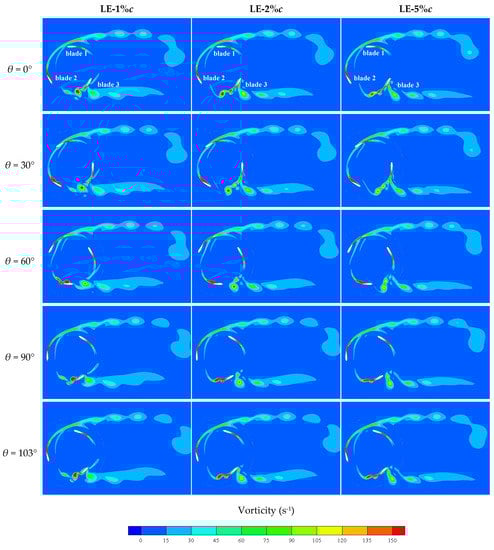 Figure 12 presents the instantaneous contours of vorticity magnitude around the blades with different airfoil leading edge radius at TSR = 2.0 at azimuth angles of 0°, 30°, 60°, 90°, and 103°. During the whole rotational period, a periodic vortex shedding phenomenon is observed on the surface of blade 1. From the azimuth angle of 0° to 103°, the flow always attaches on the surface of blade 1, indicating that a maximum instantaneous torque coefficient is generated at θ = 103°. This has been confirmed from Figure 9b. Meanwhile, the vortices of the LE-1%c, LE-2%c, and LE-5%c model around blade 1 show a very small difference, suggesting that the discrepancies of instantaneous torque coefficient for blade 1 among the three models are negligible. Afterwards, a large area of vortices appears on the inner surface of blade 1. The vortices further develop with the rotation of blade 1 and extend over a large region, leading to a vortex shedding. These contribute to a decrease in the instantaneous torque coefficient of blade 1 from the azimuth angle of 103° to 180°. The vortices continue to shed until the azimuth angle reaches 270°. The shed vortices dissipate and fade away gradually in the downstream regions due to the occurrence of the interactions with free stream. From the azimuth angle of 270° to 360°, the flow gradually reattaches to the surface of blade 1. In general, the vortices of the LE-1%c model are stronger, larger, and diffuse slower than those of the LE-2%c and LE-5%c model, which is the main reason for the observed differences in instantaneous torque coefficient of Figure 9b. All these results indicate that the best aerodynamic performance is achieved by the LE-5%c model at TSR = 2.0.