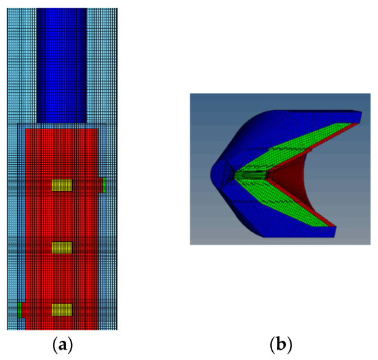 Figure 4a shows the vertical section of the mesh model, and the vertical section of the mesh model of the perforating bullet is shown in