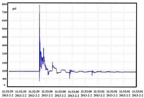 Figure 6 show similar trends, in which the perforation pressure reaches peak instantaneously with the detonation of the perforating bullets. Then, the oscillation occurs when shock waves are reflected back and forth in the wellbore, and the attenuation occurs due to propagation in the wellbore fluid. Finally, the pressure value tends to be stable after perforation. The measured peak pressure during perforating is 7900 psi (54.57 MPa). According to the prediction model of perforation peak pressure of Equation (13), the result can be obtained. The downhole effective volume for perforation can be calculated in: