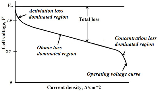 where Vact is the activation voltage loss, Vohm is the ohmic voltage loss, and Vcon is the concentration voltage loss