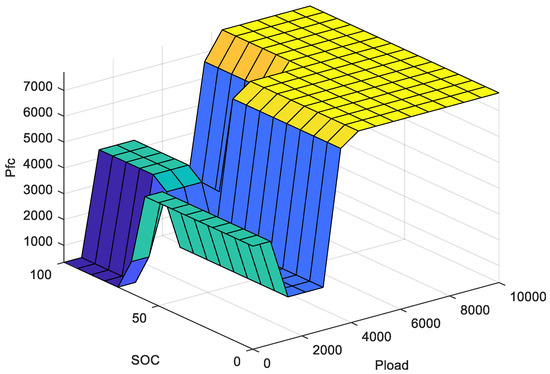 In this work, the load’s power and the BS SOC were taken as the inputs of the FLC, while its output was the FC’s power. Figure 2 illustrates the 3D surface of the MFs of the FLC of the FC system.