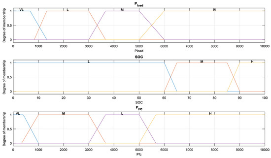 The MFs of the input variables, the load power, the SOC, and the FC power are illustrated in Figure 3. They are characterized by numbers of trapezoidal MFs of 5, 3, and 5, respectively. The fuzzy rules of Mamdani-type, used in this work, are constructed as listed in Table 1. The inference “max-min” and the defuzzification “COG” methods are utilized. The FC output current IFC can then be estimated in terms of the PFC resulted from the FLC and the FC voltage VFC.