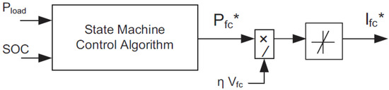 Figure 5 illustrates the schematic diagram of the SMCS. More details about the states/decisions of SMCS can be found in [29]. From the figure, the FC power can clearly be estimated from the battery’s SOC and the load’s demand. Also, the output of the SMCS algorithm was the FC’s reference power. Therefore, to obtain the FC’s reference current, the response of the SMCS was then divided by both the FC voltage and the boost converter efficiency. The main disadvantage of this algorithm is the difficulty of switching between the different conditions. To overcome this problem, a hysteresis control is required. Consequently, this issue has an effect on the response of the EMS when the demand in the load changes.