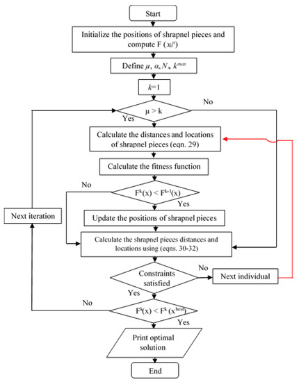 Sadollah et al. introduced an optimizer inspired from observing the explosion of mine bomb, known as the mine blast algorithm (MBA) [30]. More details about the MBA optimizer can be found in [30]. In case of exploding the mine bomb, pieces of shrapnel are scattered and combined with other mine bombs near the scene of the blast that causes exploration of other bombs. In the MBA, the main objective of this algorithm is to obtain the most explosive mine bomb that produces the maximum number of damages. Shot-point is the initial mine bomb in this algorithm, and it is represented by x0n, where n is the shot-points number. This point generates shrapnel pieces that representing the individuals of number Ns and saved in a population. The shrapnel pieces explore new position of the mine bomb as given by the following equation: