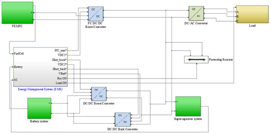 Every day, the need for alternative sources of energy, other than traditional fossil fuels, becomes clearer. Fossil fuels such as petroleum oil, coal, and natural gas proved that they have extreme and harmful effects on the health, as well as the environment. Carbon dioxide (CO2) gas, emitted from the combustion of these fuels, increases the air pollution. In addition, CO2 is unfortunately depleting the ozone layer that is protecting the earth from the ultraviolet (UV) radiations emitted from the sun. The depletion of ozone layer is the main cause of the notable increments in the universe’s temperature. Moreover, the reserved fossil fuel decreases as the world’s population increases. In a recent study, it was predicted that oil, gas, and coal would run out by 2052, 2060, and 2088, respectively [1]. For the above reasons, scientists are persuaded to look for alternative sources other than the fossil energy. However, in this case, the new sources should be environmentally friendly. Fuel cell (FC) is one of these new, environmentally friendly, and green sources of energy. FC is an electrochemical device that is able to convert the chemical potential into an equivalent electrical potential. One of the main advantages of using FC is that its reaction outputs are electricity, water, and heat, which makes it a completely pollution-free energy source. Furthermore, unlike the traditional combustion engines, it has no moving parts. FCs are found in many types: Proton exchange membrane FCs (PEMFCs), phosphoric acid FCs (PAFCs), solid acid FCs (SAFCs), alkaline FCs (AFCs), and high-temperature FCs such as solid oxide FCs (SOFCs) and molten carbonate FCs (MCFCs). PEMFCs are considered as the most commonly used FCs and were adopted in this work because of their ability to operate at lower temperatures [2,3]. This characteristic allows PEMFCs to reach from idle-state to full-load operation quickly. PEMFCs, like other FC types, use hydrogen (H2) gas as a fuel. In general, the FC’s power system is characterized by its slow response to a highly fluctuated demand. Therefore, a hybrid system composed of fuel cell (FC)/supercapacitor (SC)/batteries (BS) is highly recommended to solve the problem of this slow response. Such system requires an optimization of the FC’s power utility to obtain a better economical fuel consumption and performance when a part of the load power is handled by the BSs and/or SCs. Due to the importance of having a proper and efficient control system to switch between the three sources of energy, several energy management strategies (EMSs) were proposed in the literatures. An intensive literature review of the previous work, related to the EMSs, is presented as follows.