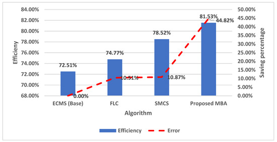 The comparison between the performances of the studied EMSs was carried out using Matlab© simulations. Figure 8 illustrates the Simulink model of the proposed FC/BS/SC hybrid system. It consisted of the following: A 12.5 kW, 30–60 V PEMFC type; a 48 V, 40 Ah battery storage; six series-connected SC, each with a rating of 15.6 F and 291.6 V; and a 12.5 kW FC DC/DC boost converter. Two DC/DC converters were used to control the battery storage. The first converter had 4 kW boost type to discharge the battery and the second had a 1.2 kW buck type to charge it. A 15 kVA, 200 V AC, 400 Hz inverter was employed to feed the AC load demand. For fair assessment of the simulations, the initial conditions for the BS and SC system were set to the same values. The two key factors for comparing the performance were the H2 consumption and the system efficiency. The efficiency was calculated via dividing the average load demand power by the average power generated from the fuel cell/battery/supercapacitor system. The comparative study of the H2 consumption and the overall efficiency was obtained using the proposed MBA-based EMS strategy and the other studied strategies given in Figure 9. The H2 consumption in Figure 9 was computed as a tolerance w.r.t., the approach that gives the largest H2 consumption which, in this case, is the ECMS. From the obtained results, one can see that in terms of the H2 fuel economy and the efficiency, the best EMS strategy among all studied strategies is the MBA-based optimizer. Applying the MBA optimizer decreased the H2 consumption to 19.85 gm, which is around a 10.5% decrease compared to both FLC and SMCS, and a decrease of 44.8% compared to the ECMS strategy. Furthermore, the efficiency was increased by 8.8%, 3.6%, and 12.19% compared to FLC, SMCS, and ECMS, respectively. Similar work has previously been done by Njoya et al. in [29], where the values of the overall efficiency using PI control and ECMS were 80.28% and 80.47%, respectively. This proved that the efficiency obtained through the current proposed MBA optimizer was better than that obtained in [29], despite a slight difference. Therefore, the proposed MBA-based management strategy was found to be superior among the compared strategies of SMCS, FLC, and ECMS in both hydrogen fuel economy and overall efficiency.