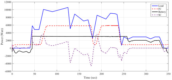 Figure 12, Figure 13 and Figure 14 can help to explain and understand the modes of operation as follows: At t = 0, the load demand was zero, so the FC started to charge the BS. At t = 40 s, the hybrid FC/BS/SC system started to supply the power to the load, and the excess load demand was fed using SC since it has a fast response to the sudden power demand. At the same time, the FC power increased gradually. At t = 45 s, the SC voltage level decreased under the reference voltage level (270 V). Accordingly, the BS was used for regulating the SC voltage in order to reach to the reference value again. At t = 48.5 s, the SC voltage equaled the reference voltage, so the BS gradually decreased its power to zero. Hence, the FC supplied the total load demand and recharges the SC simultaneously. At t = 60 s, the SC fed the excess transient load demand, whereas the FC power increased gradually. At t = 61.5 s, the BS regulated the DC bus voltage to the reference level and supported the FC in order to supply the excess load demand. At t = 70 s, the FC output power reached its maximum and the load’s extra demand was fed by the BS. At t = 110 s, the BS also reached its maximum and, in this case, the SC handled the load’s extra power. At t = 125 s, the load power decreased to a value lower than the FC maximum power. Because the FC response is usually slow during transients, the extra FC energy was then shifted for charging the SC. At t = 126 s, the DC bus voltage reached 270 V. However, the BS discharged and dropped to zero. At t = 170 s, the load demand decreased to a value lower than the FC maximum power. Therefore, the extra FC power was then used to charge both the BS and SC. At t = 180 s, the load increased abruptly, so the SC responded quickly to this fast change and handled the extra load demand. At t = 185 s, to regulate the DC bus voltage, the BS discharged to help the FC in supplying the power to the extra load demand. At t = 235 s, the load power was suddenly decreased. Accordingly, the exceeded FC energy was then used to charge the BS and SC. At t = 250 s, the FC approximately supplied the total load power. At t = 330 s, the load demand was reduced to zero. Therefore, the FC gradually decreased its power to its optimal power and also recharged the BS.