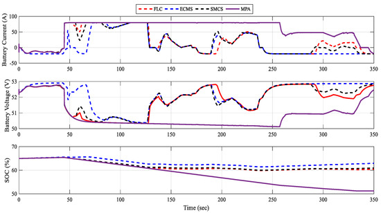 Time responses of the battery’s state of charge (SOC), current, and voltage.