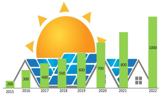 The worldwide interest in environmentally friendly power resources is exponentially increasing. Among several renewable energy systems (RESs), solar photovoltaic (PV) systems are one of the major types of distributed renewable energy (RE) generation that has unlimited supply capacity and is forecasted to become the largest source of RE by 2022. The solar PV capacity for network-connected application was estimated to be 509.3, 600, 700, 800, and 1000 GWp in 2018, 2019, 2020, 2021, and 2022, respectively [1]. The global PV capacity has been continually rising, and the yearly growth curve from 2015 to 2022 is illustrated in Figure 1.