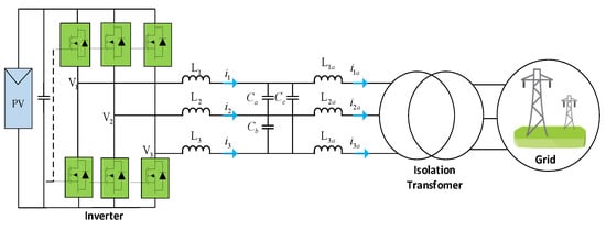 The overall structure of a grid-connected PV source is illustrated in Figure 2. It consists of four main components: (i) a PV array that generates direct current (DC) power; (ii) a three-phase inverter, which is adopted to convert the DC to alternating current (AC) power; (iii) an LCL filter, which is used to suppress the switching harmonics generated by grid-connected inverters at the output voltage and current; and (iv) a transformer that is used to step up the PV voltage while ensuring galvanic isolation.