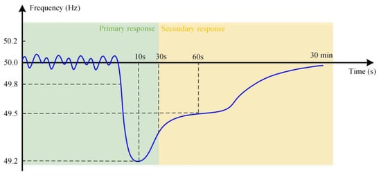 As illustrated in Figure 3, the system frequency in normal conditions is near to its nominal frequency (50 Hz). However, when an event occurs, the system begins to deviate. This imbalance must be adjusted using frequency control loops. To improve the system stability, these controllers are employed and they cover two times frames: the primary frequency response (PFR) and the secondary frequency response (SFR).