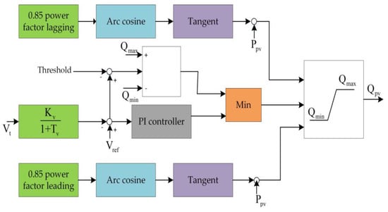 Figure 4 shows the proportional integrator (PI) controller that is included in this AVC scheme in conjunction with a PV inverter. The error signal driving the PI controller corresponds to the difference between the reference terminal voltage, Vref, and the measured terminal voltage, Vt. The implemented AVC of the PV generator operates in a range from 0.85 lagging to 0.85 leading. Due to the fault of the short circuit (SC), the RP amount required by the controller is achieved at the peak. After SC, an over-voltage phenomenon occurs; thus, an over-voltage protection loop is introduced when the voltage is reduced under a boundary value [28]; thus, the RP demand decreases to the maximum value of Qmin.