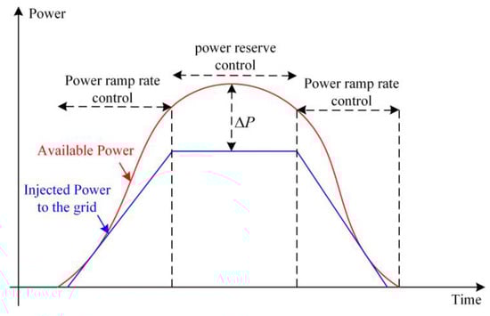 In [36], using the MPPT control lead to limit the generated power from PV, a smoothing effect was proposed to limit the PV ramp-ups to 1% of the PV rated capacity per minute. In this study, the limitation of PV production was not addressed when radiation decreases. It has been concluded that the output fluctuation declined by 28%. A case example of an active PC is shown in Figure 5, where the power could be curtailed either through MPPT interference or ES functionality as stated earlier.