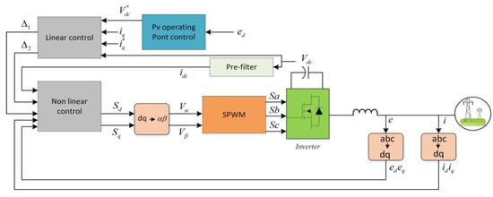 Fault ride through (FRT) capability is a grid interconnection requirement for solar PV systems to avoid technical issues such as cascading frequency drop. In [43], the implementation of fundamental measures to facilitate PCS performance improvement in terms of FRT were studied and proposed. In the case of a voltage drop, PV converters are not obliged to break down. Knowing that the operation of the PV system is disconnected, the recovery of the output of the PV system is necessary to quickly prevent any variation in the frequency of the power system. In other studies [44,45], considering LS PV systems in MV networks, control methods are dedicated to ameliorating the FRT capability in the grid. The detailed fault analyses highlighted the robustness of the controller in LS PV networks. A non-linear feedback controller (LFC) has been suggested [46] to guarantee the actual rate and maintaining the FRT function of solar PV. The proposed control strategy is illustrated in Figure 7.