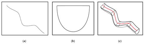 Sketch map of river channels modelling process: (a) Channel trace; (b) default parabolic cross-section shape; (c) perspective view of a simplified 3D channel highlighting the central line (red) and some cross-sections.