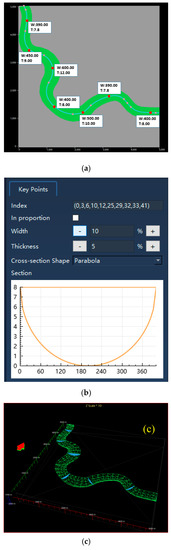 Figure 5 shows a 3D channel model (Figure 5c,d) generated from 2D sketching with key points of variable width and thickness (Figure 5a) by DMatlas, which are flagged as statistical average values from user-defined distribution. The default shape and dimensions of cross-sections are editable with all the key points selected (Figure 5b).