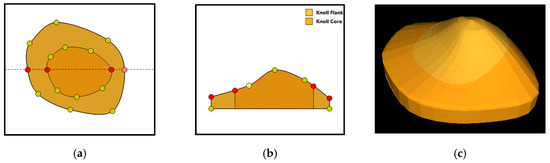 As to user interaction, both the geometry of top plane view (Figure 10a) and the maximum vertical cross-section (Figure 10b) are needed to be defined. By adjusting the locations of controlling points (yellow and red circles in Figure 10), a knoll reef is modelled in 3D as Figure 10c shows.