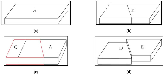 Figure 11 shows a general dip-slip fault modeling process. The model A (Figure 11a) is to be faulted by Fault B (Figure 11b). First, a model C (Figure 11c) is constructed according to user-input fault parameters. And then the model D is intersected via Boolean operation with model A and C. At last, model E is obtained with the Boolean difference operation between model A and D, together with model D comprising a completed fault model (Figure 11d). All geological body models are divided into two parts after such an operation by one fault.