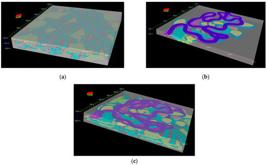 The ‘model library’ in DMatlas refers to the hundreds to thousands of models accumulated during the construction of conceptual models, case models and field models, out of study and research necessity, or real projects practice. The models in the library are sorted with their attributes such as depositional environments, field names, facies types, geological ages, and representative basins. Geologists can input keywords to search for models which closely match their target model(s). With customization of the model, modelers can rapidly create their own model. The modelling time is sufficiently reduced in this way. Figure 12 shows a fast-build fluvial model (Figure 12c) by importing, copying, shifting, rotating and (proportionably) changing thickness/with of channels and other sandbodies from two anastomosing (Figure 12a) and meandering (Figure 12b) models.