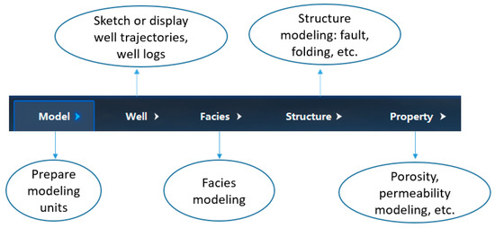The fundamental idea of DMatlas is to model where the different facies bodies are present today and prototype sedimentary concepts rapidly. Users model reservoirs in a guiding sequence of (1) sedimentology, (2) structure, and (3) petrophysical properties, which corresponds to five modules of DMatlas workflow (Figure 13) that include (1) Model, (2) Well, (3) Facies, (4) Structure, and (5) Property: