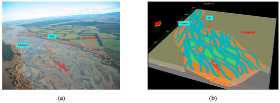 Modern braided river image (a) and corresponding model by DMatlas (b).