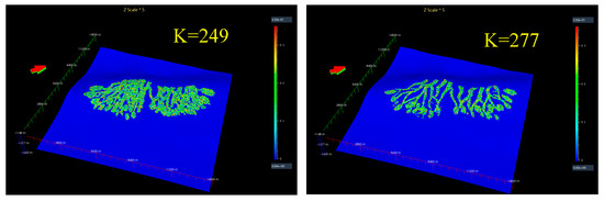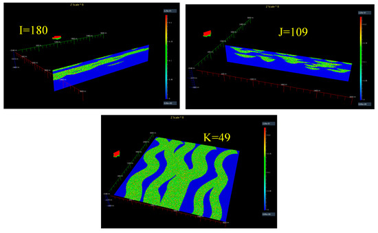 Figure 21 shows I/J/K section view of porosity modelling result from the Member 8 of the Shihezi formation (P1h8) of partial Sulige Field in central Ordos Basin, North China [19,20,21], with a grid number 300 × 300 × 60. Porosity has a normal distribution with average 0.12, standard deviation 0.05, and cut-off of min 0.07 and max 0.22. Permeability was modelled with a linear relationship with porosity, ranging from 0.5–20 mD [22].