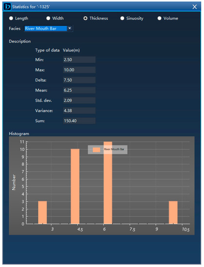There is a tool to estimate whether the thickness or other geometry parameters match the statistics. Take the river mouth bar deposited at the depth of 1325 m TVDSS (True Vertical Depth SubSea) as an example, statistical result is as shown in Figure 28.