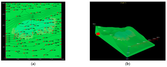 (a) Depth controlling points and resulting contours used to deform the formation; (b) Lower Dongying formation with variable thickness in 3D (Z Scale: 5).