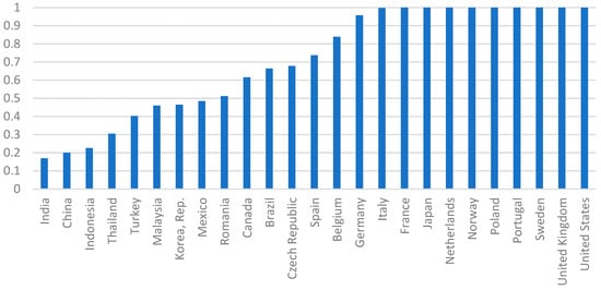 When considering the whole observation period from 2008 to 2017, eight out of the total of 25 selected countries were efficient in terms of energy with a corresponding score of 1 such as France, Italy, Japan, Norway, Portugal, Sweden, the United Kingdom, and the United States. The average score of Germany was 0.96 (relatively efficient), while the average scores of other countries were lower than 1 and ranged from the lowest of 0.17 (India) to 0.84 (the Netherlands). India had the lowest efficiency for all of the 10 observed years with a score under 0.2, followed by China and Indonesia with average scores around 0.2.
