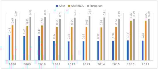 The average score of the countries from the Americas was stable during 2008–2015, then notably increased from 2016 to 2017. Among the selected countries from the Americas, two northern countries had higher scores than the two southern ones from 2008 to 2015. From 2008 to 2017, the United States was always efficient with a corresponding score of 1, while Canada and Mexico remained stable with average scores around 0.6 and 0.4, respectively. Regarding the data in Table 2, the average score of Brazil fluctuated and ranged from 0.5 to 0.66 from 2008 to 2015, then rapidly increased to 1 over 2016–2017, which helped the average score of the Americas become higher in those two years and narrowed the distance with the average score of European countries.