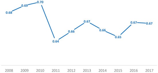 As a whole observation, the average energy-efficiency score of 25 countries was around 0.67 during 2008–2017, illustrated in Figure 4.