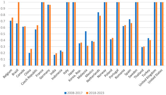 Additionally, by comparing the average efficiency of each country over two periods, it reveals that 10 countries (Belgium, Brazil, Canada, China, Czech Republic, India, Korea Republic, Poland, Romania, and Thailand) will experience an increase in efficiency while six countries will suffer the opposite trend (Indonesia, Malaysia, Mexico, the Netherlands, Spain, and Turkey).