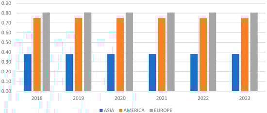 As above-mentioned, there is a large gap between the average score of European and countries in the Americans versus those of Asian countries from 2008 to 2017. This will not disappear during 2018–2023, as the average score of European, American, and Asian countries will be 0.81, 0.75, and 0.38, respectively. The gap between European countries and that of the Americas will be narrower while the gap between European and Asian countries will widen.