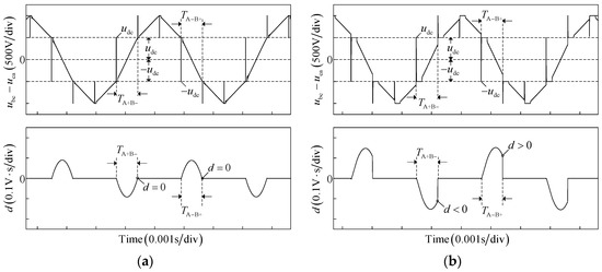 Figure 6 shows the diagram of the line voltage difference and its integral in the conduction period of phase A+B− and A−B+. The as seen in Figure 6, the line voltage difference is equal to the DC-link voltage in the freewheeling period and the corresponding integral linearly increases in the interval. Compared with that in Figure 4, since the disturbed voltage difference is integrated in the freewheeling period , the integral under different commutation produces an amplitude deviation. Especially under accurate commutation, for example, the integral deviates from zero, and becomes positive and negative in the conduction period of phase A+B− and A−B+, respectively.