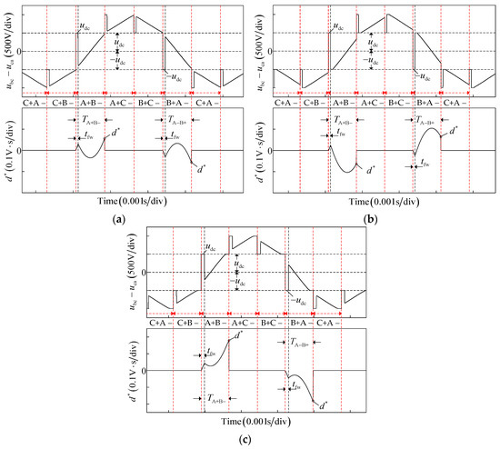 Assume that the commutation error is and the conduction interval of VT1 and VT6 lasts for the period when , as shown in Figure 2. In the conduction period, the line voltage difference integral can be expressed as