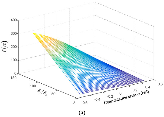In general, the EMF harmonic coefficients of a BLDC motor with a trapezoidal back EMF [25] . The relationship between , , and the commutation error during the freewheeling period can be obtained in (26). When , , and the corresponding 3-D graph is shown in Figure 7a. It is observed that with respect to , is greater than zero when the commutation error , so . When , , and the corresponding 3-D graph is shown in Figure 7b. is less than zero when the commutation error , and . Based on the relationship, it is derived that and . Both sides of are multiplied by , and the item is represented as , where denotes copper loss and . denotes the input power of the motor and . In general, the copper loss is negligible, hence it satisfies , which implies Therefore, (19) is simplified as