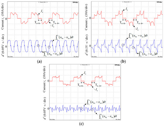 Phase current and the line voltage difference integral. (a) Advanced commutation; (b) Delayed commutation; (c) Exact commutation.