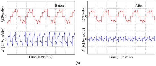 Current waveform of phase C before and after compensation. (a) Commutation instants are delayed by 10° at a speed of 1000 rpm and load torque of 12 Nm; (b) Commutation instants are delayed by 12° at a speed of 1500 rpm and load torque of 16 Nm; (c) Commutation instants are advanced by 12° at a speed of 850 rpm and load torque of 10 Nm; (d) Commutation instants are advanced by 14° at a speed of 1200 rpm and load torque of 14 Nm.