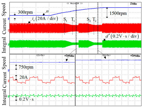 Subsequently, the performance of the proposed strategy during the transient process is tested. In the experiment, the commutation instants are delayed by about 10°, and the motor is accelerated from 300 rpm to 1500 rpm at a load torque of 12 Nm. Figure 14 shows the phase current, the line voltage difference integral, and their enlarged vision with the proposed strategy. When the motor speed ramps up, the compensation strategy is initiated at the points S1 and S2, and the commutation error is almost removed at the points T1 and T2, respectively. It is seen that, after the compensation strategy is activated, the current fluctuation is effectively reduced. Therefore, the proposed compensation strategy exhibits satisfactory dynamic performance during variable-speed operation.