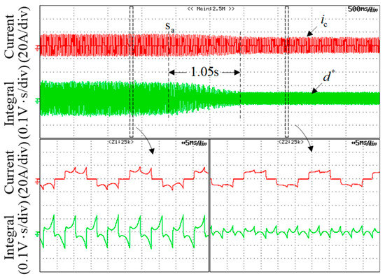 To test the convergence rate of the proposed strategy under the steady speed operation, the commutation error is set to about 10°, and the motor runs at a speed of 800 rpm and load torque of 12 Nm. Figure 15 shows the phase current, the line voltage difference integral , and their enlarged vision with PI controller. It is found that, before the point of Sa, the phase current curls up and the integral is high, while the compensation strategy with PI controller is activated at the point Sa, the current ripple and the integral gradually decreases. After 1.05 s, the current fluctuation is effectively suppressed, and the commutation error is almost eliminated. In addition, the convergence rate of the proposed method is tested at different speeds, and the test results are shown in Table 5, and the results show the proposed strategy converges quickly in a wide speed range.
