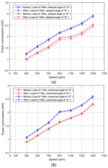 Power consumption comparison before and after compensation. (a) Under delayed commutation; (b) Under advanced commutation.