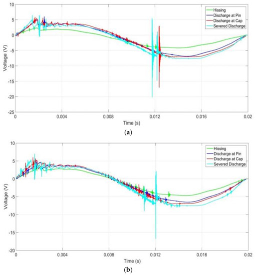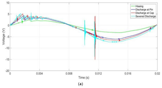 A trend could also be observed concerning the number of disturbances due to the presence of discharges in the first and second half cycles of the signals. In the first half cycle, hissing had the least disturbances, with the number of disturbances increasing with increasing discharge intensities. This was also observed in the second half cycle albeit with higher disturbances compared to the first half cycle. Additionally, the disturbances in the second half cycles for lower discharge intensities were minimal.