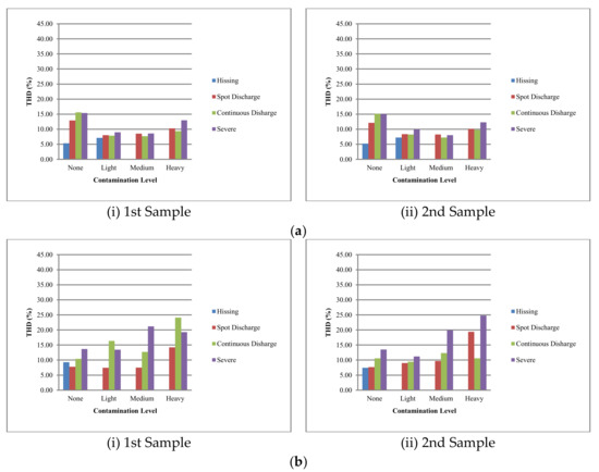 From Figure 14, with respect to contamination levels, it can be seen that there is a general trend in the THD values of the insulator samples as their discharge intensity increased. At hissing discharge level, the signal distortion was normally low. As the discharge intensities increased, the disturbances increased which gave rise to harmonics, thus leading to the increase in the THD levels of the UV signal.