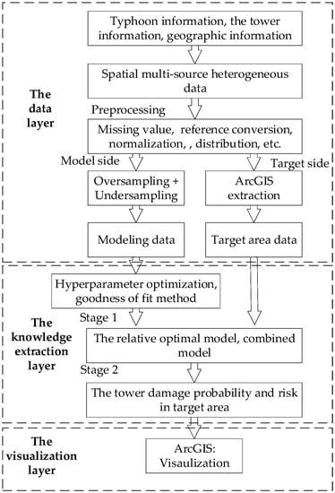 This paper proposes a risk assessment and its visualization method of power tower under typhoon disasters based on machine learning algorithms. The overall framework is shown in Figure 1. It is divided into three layers: the data layer, knowledge extraction layer, and visualization layer.