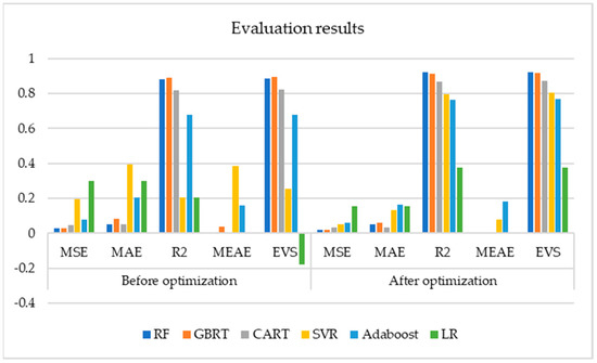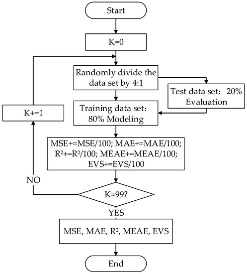 As shown in Figure 2, firstly, the model side data is randomly divided into training set and test set according to a ratio of 4:1, and the model is built on training set by using default hyperparameters [34] in Python 3.6. Because this study uses regression methods, regression evaluation indicators are employed to evaluate the models. Five indicators including MSE (mean squared error), MAE (mean absolute error), R2 (R–squared), MEAE (median absolute error), and EVS (explained variance score) are evaluated on test dataset. The cycle index K is set as 100, and the average value of each indicator is taken as the evaluation result of the original model.