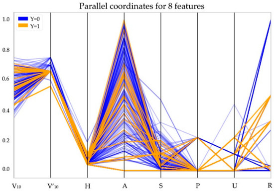 The parallel coordinates visualization of features is shown in Figure 4. The abscissa represents normalized features, and the ordinate represents their value. Y = 0 and Y = 1 represent the undamaged state and the damaged state, respectively. Using parallel coordinate visualization, the relationship between each feature and Y can be initially diagnosed.