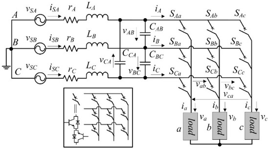 The direct matrix converter (MC) carries out direct AC-to-AC power conversion, and it does not require any bulky energy storage elements. This converter provides many benefits, including bidirectional power flow, controllable input power factor, compact volume, and higher power density [1,2,3,4]. Therefore, MCs attract tremendous research interest and are proposed for many application areas. Some manufacturers, such as Yaskawa and Fuji, have commercialized some MC products and modules. Table 1 summarizes some information of some MC products that are commercialized in the industry. As seen in this Table, the maximum voltage and power ratings reach 6.6 kV and 6 MVA in Yaskawa MX1S series. The main application area is oriented to industrial motor drives.