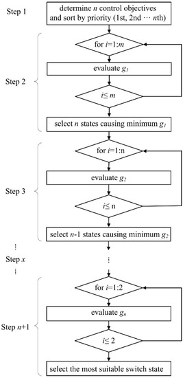 Step n + 1: Evaluate the two switch states selected in the previous step and select the most suitable switch states that render the minimum values of gn for regulating the nth control objective. The selection in this step is final and will be applied to the converter.
