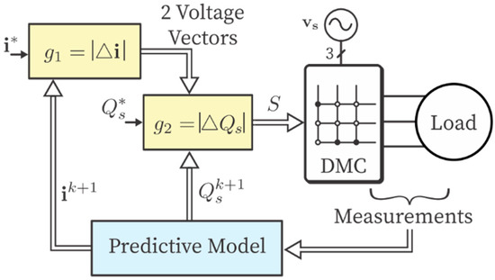 In this work, there are two control objectives (n = 2), i.e., the load currents and input power factor considered in SMPC for MC. The main control objective is the regulation of the load currents, so it has the highest priority. There are 27 (m = 27) allowable switch states in total in the MC. The cost functions for optimizing the selection of switch states for load currents and the input power factor are individually defined in: